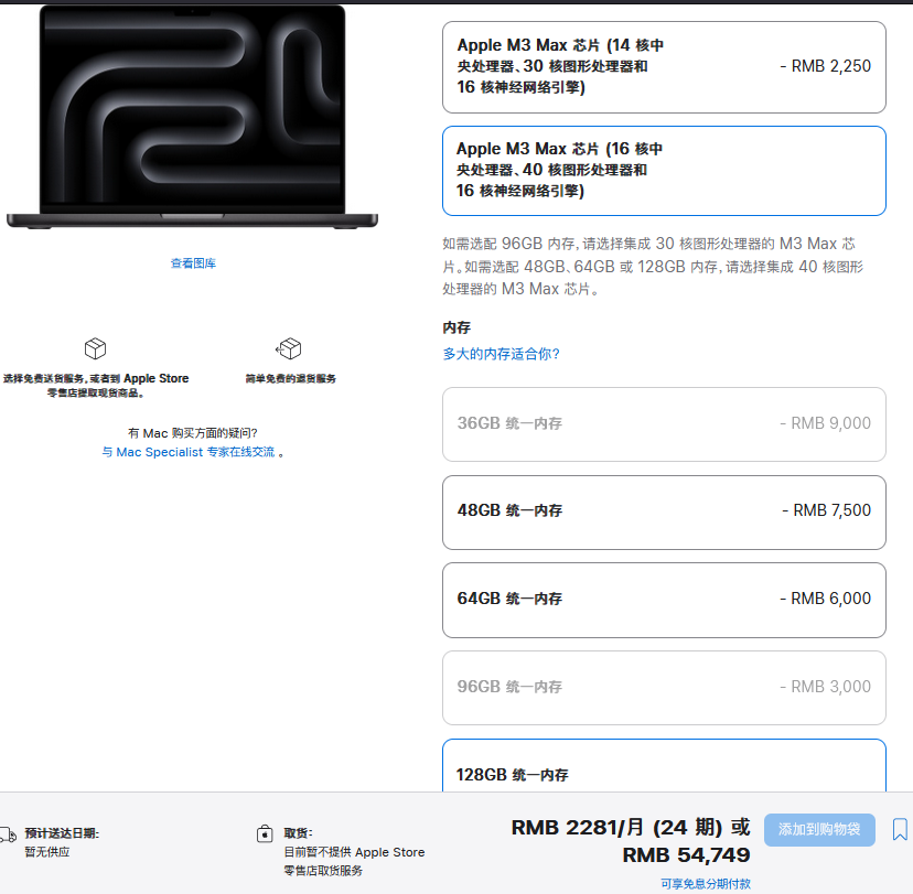 其中14英寸Macbook Pro起售價1599美元(約合人民幣11700元),16英寸起售價2499美元(約合人民幣18300)元。若想擁有蘋果最先進的M3 Max芯片的14英寸Macbook,價格24999元起,如果選擇了最高配(16核CPU版本、128GB統一內存、8TB固態硬盤),售價超過5萬元。