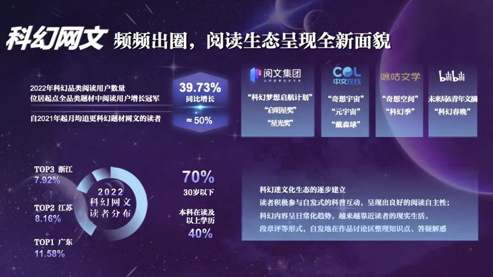 《中國科幻網絡文學白皮書(2022)》也指出,起點中文網首次創作便選擇科幻題材的作家中,72%為00後,超7成的科幻品類簽約作家為本科在讀及以上學歷。讀者中近70%的科幻品類閲讀用户年齡在30歲以下,40%左右為本科及以上學歷。
