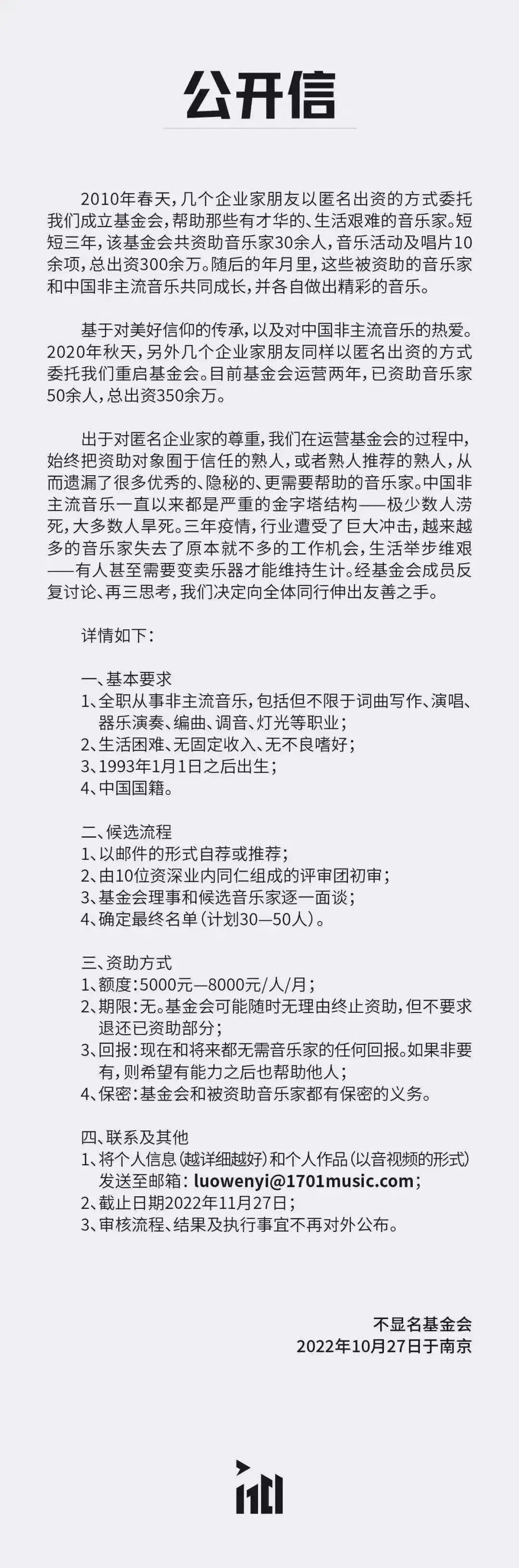 彼時,該基金會在南京 “1701 Music Park”公眾號上發佈了第一封公開信,表示將扶持範圍從原來的熟人推薦,轉而擴大面向全行業生活困難、無固定收入、無不良嗜好的年輕音樂行業從業者提供幫助。基金會接受郵件自薦或推薦,通過評審團初審與基金會理事逐一面談的方式,在候選者中篩選出30-50名幫扶對象。