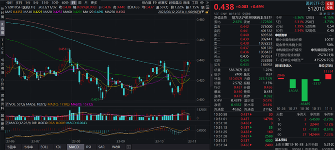 截至2023年11月2日10:51,醫藥ETF(512010)早盤震盪上行,已漲0.69%,盤中成交額達2.57億元,成交額不斷擴大,市場交投活躍。