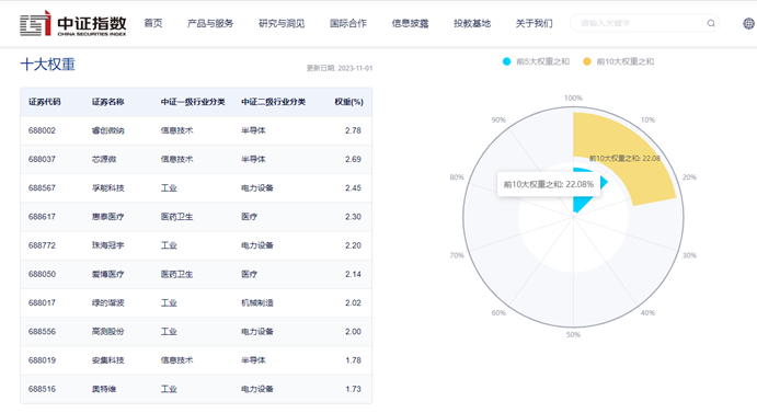 數據顯示,截至2023年11月1日,該指數前十大權重股包括睿創微納、芯源微、孚能科技、惠泰醫療、珠海冠宇等,前十大權重股合計佔比約為22.08%。(數據來源:中證指數公司,指數成份股不代表個股推薦)