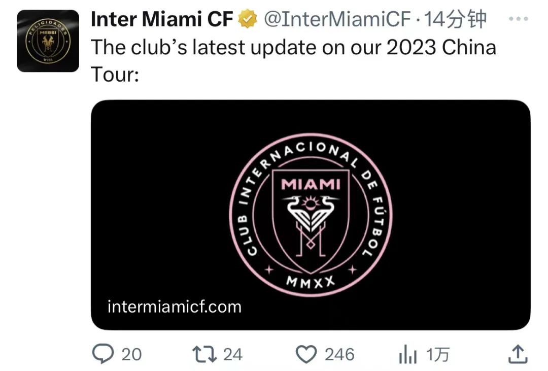 北京時間11月1日,邁阿密國際俱樂部在其官網及官方社交平台發佈文章,宣佈原定於11月的中國行取消。在文章中,邁阿密國際寫到:「巡迴賽主辦方NSN已通知國際邁阿密足球俱樂部,由於中國發生不可預見的情況,取消了中國行。邁阿密國際的雄心仍然是在全世界球迷面前進行比賽。同時,俱樂部未來將繼續探索與NSN合作的機會,以實現自身擴大全球影響力這一目標。」