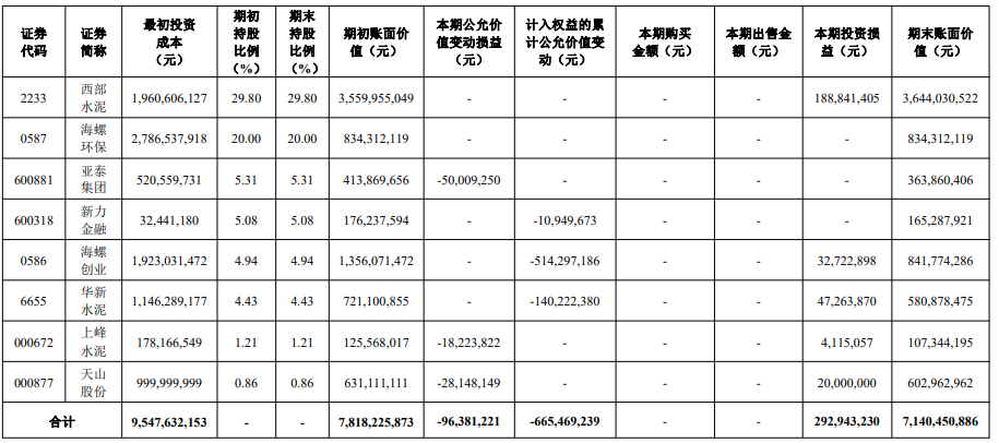 除此之外,海螺水泥還頻繁進行證券投資。海螺水泥2023年半年報顯示,公司證券投資金額高達71.40億元,其中大部分都是同行業企業。