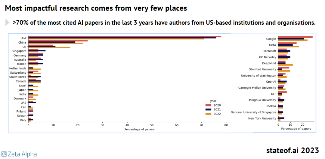 根據Air Street Capital的《2023 年人工智能現狀》報告數據,過去三年中被引用最多的人工智能研究論文70%來自美國,其次便是中國,英國位列第三。