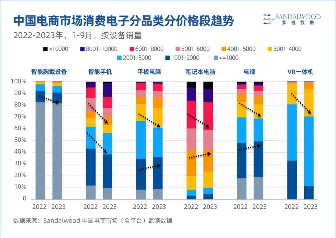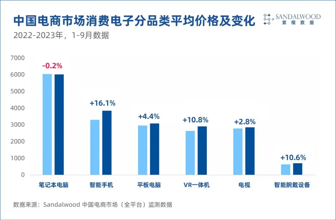 Sandalwood監測的電商數據顯示,2023年前三季度,手機的平均售價增長最為顯著,達到16.1%,其次是VR一體機和智能手腕穿戴設備,分別增長了10.8%和10.6%。
