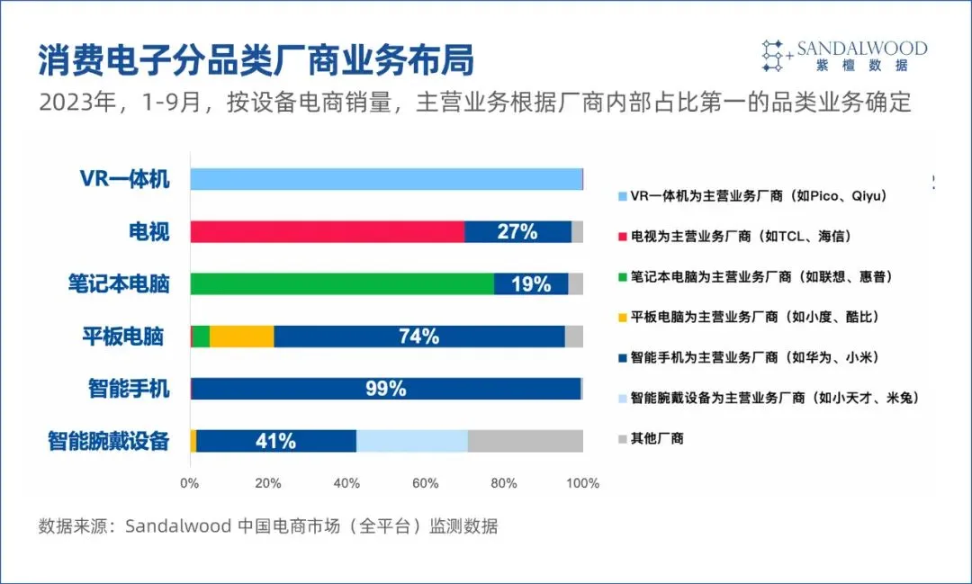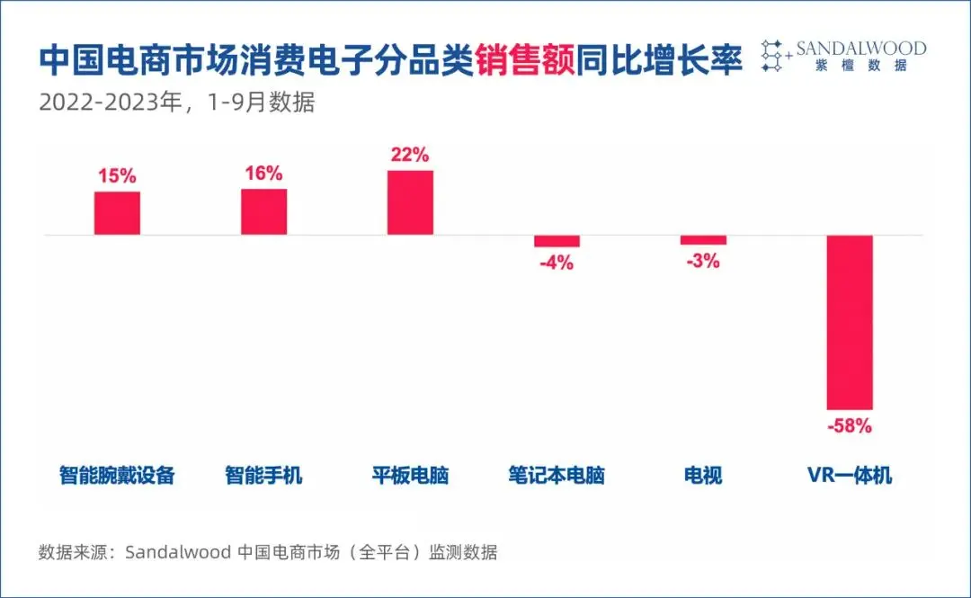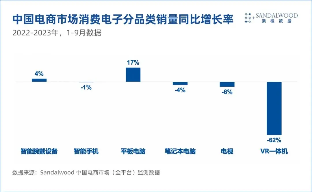 根據Sandalwood的中國電商市場監測數據,2023年1-9月,手機、筆記本電腦和電視的銷量分別同比下降1%、4%和6%,VR一體機銷量大幅下滑了62%。