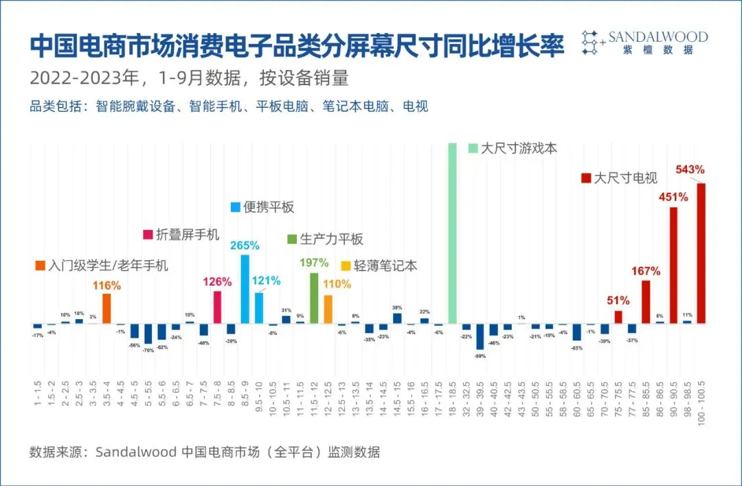 電視: 75、85、90、100寸電視的銷量增長範圍在100%-500%,顯示出人們對家庭娛樂和大屏觀看體驗的需求隨着住房升級而增長。