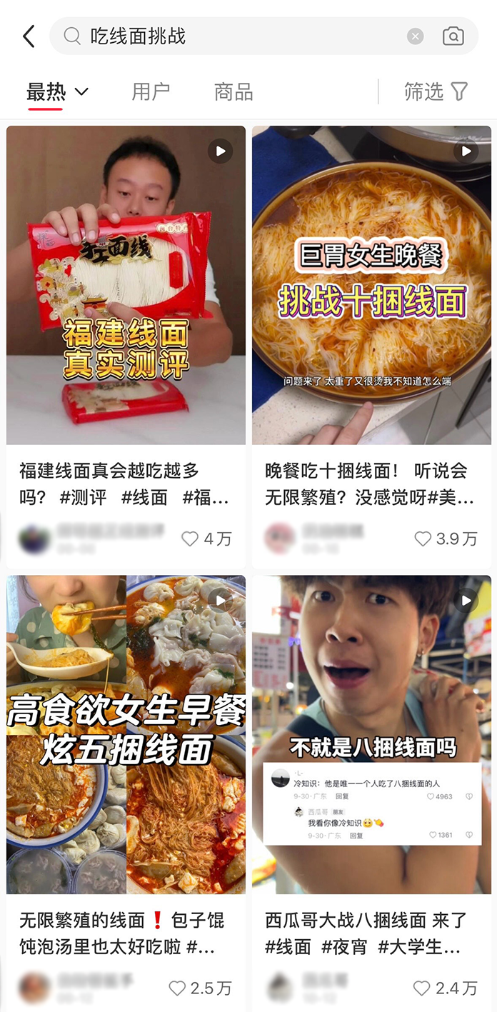 不信你看「吃線面挑戰」視頻底下的評論區。