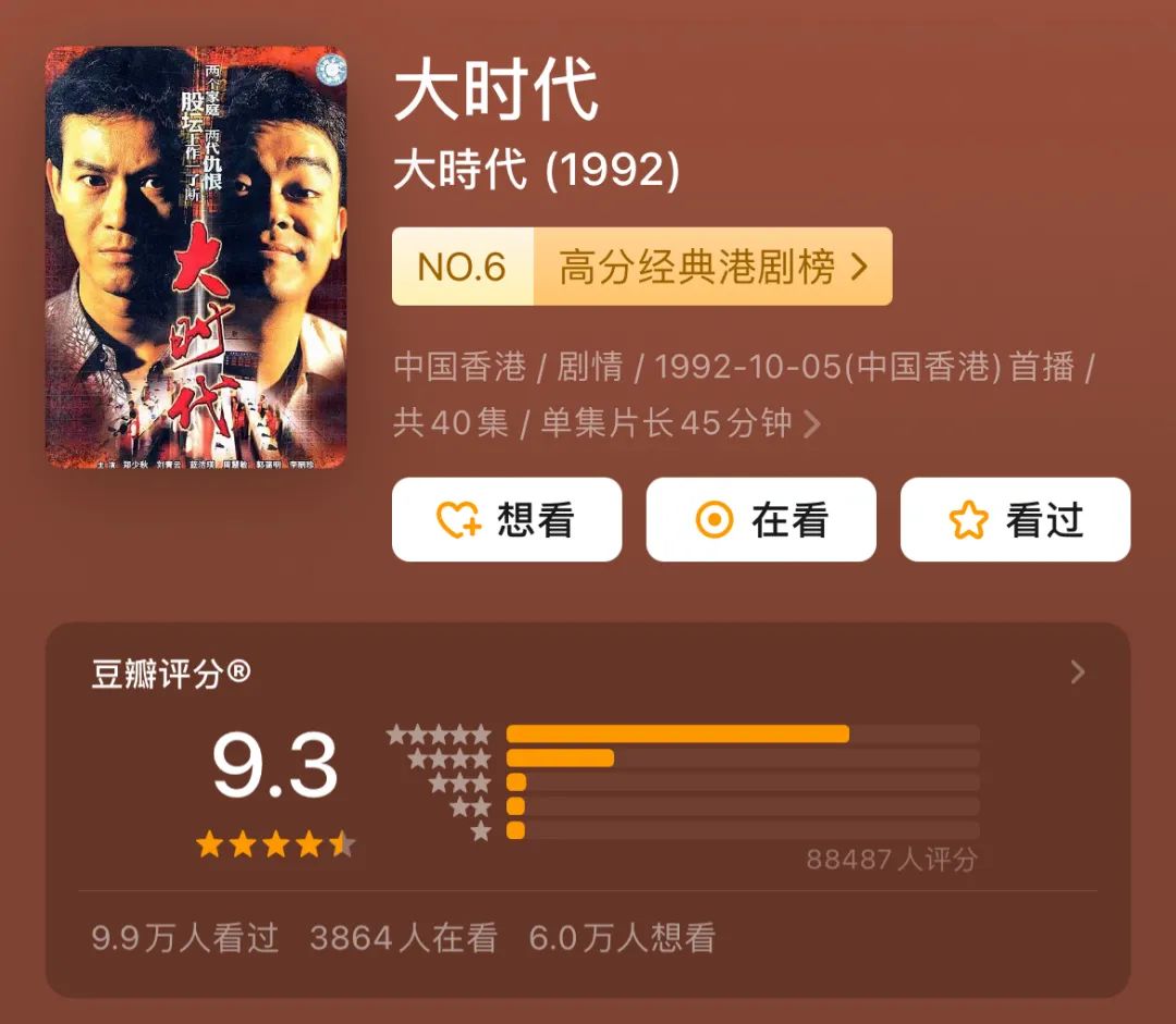 譬如,1992年,TVB出了一部台慶劇,《大時代》,引發轟動,一度被譽為“華語第一神劇”。幾年後,又有一部《笑看風雲》,亦紅極一時,主演都是鄭少秋。只是,彼時大多數內地百姓對商業還一知半解,這類商戰風雲的大劇,顯然不及“香帥”的《戲説乾隆》《小李飛刀》之類的劇來得直觀,因而在內地並未引起太大轟動。