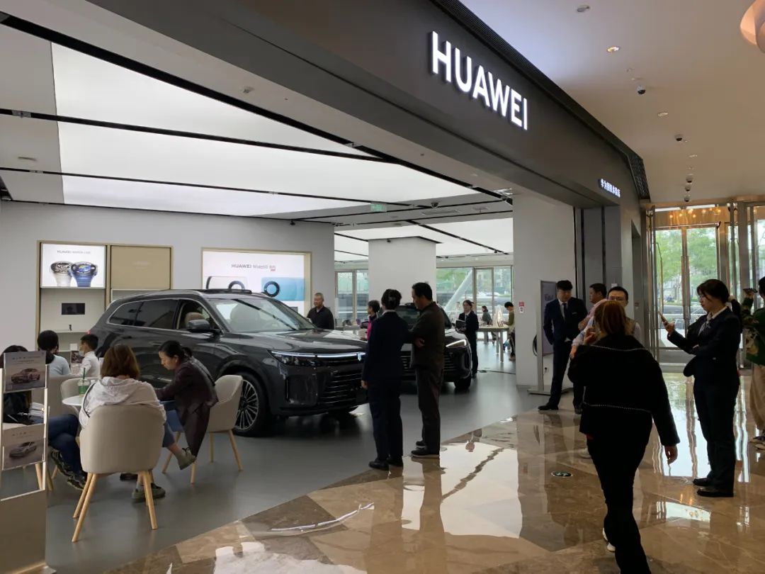 10月28日下午4點左右,時代週報記者在重慶渝北區光環華為門店看到,諮詢問界新M7的顧客絡繹不絕,在展廳的一輛新M7周邊,站了大概6名顧客,周邊還有坐着,以及較遠的顧客在看整體外觀。