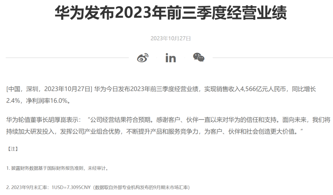 有了這個根基,2022年,華為沒有5G手機,也實現了6423億的營收總額,只是淨利率降低到了5.54%。正常年份,華為淨利率普遍維持在7.5%左右。進入2023年以後,華為第一季度淨利率進一步跌至2.3%,第二季度則扭轉攀升至15%。這時候,華為mate60還沒發佈。第三季度後,華為淨利率微增至16%。