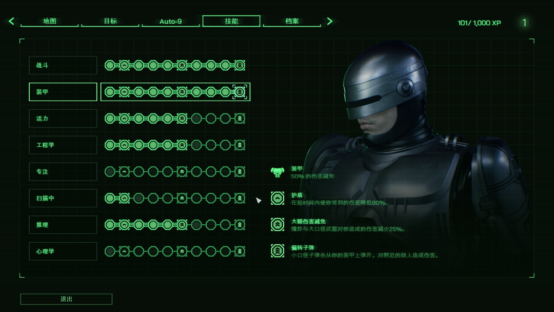 好在有失則有得,墨菲的能力被做成了一套技能樹,作為核心設計,這套系統擴展了一些電影不曾有的可能性。比如真想實現電影裏刀槍不入的效果,你需要把“裝甲”屬性點滿;把“戰鬥”屬性點滿,墨菲就能釋放毀滅性的電磁波。