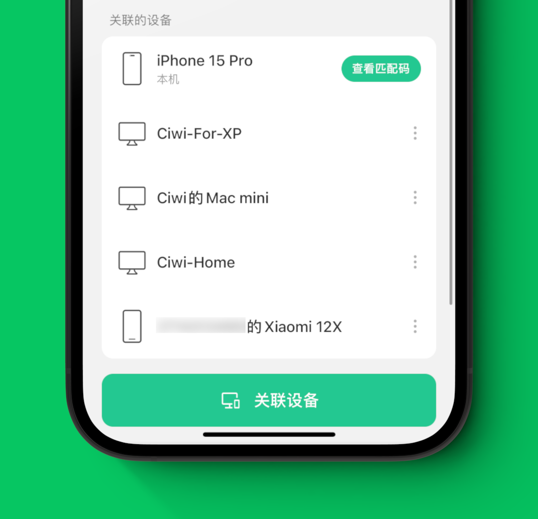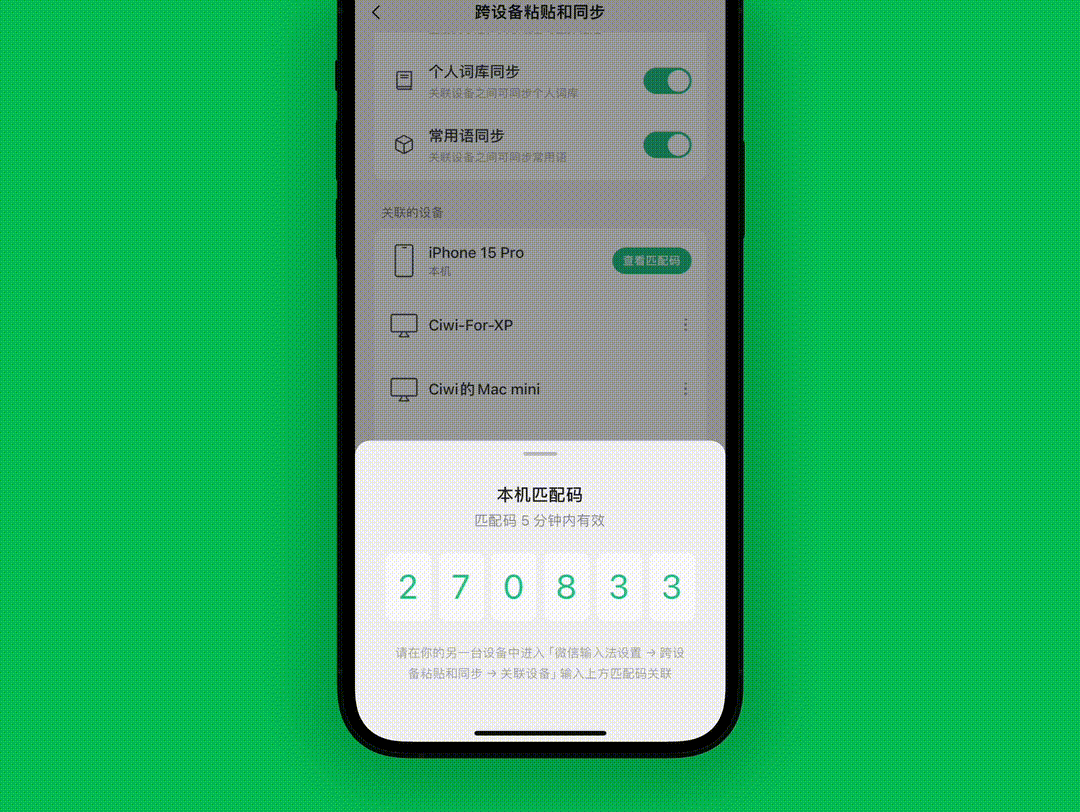 舉個例子,你只要在 iPhone 的微信輸入法裏查看一下匹配碼,然後 5 分鐘內在安卓手機 / 電腦上輸入這個碼。