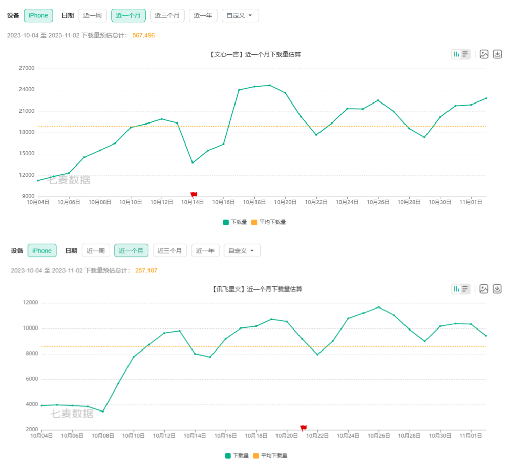 據七麥數據顯示,文心一言iOS端、訊飛星火iOS端近一個月日均下載量均在2萬以下。同時考慮到APP下載到次日留存、七日留存會存在較大的漏斗模型。顯然,當前文心一言和訊飛星火iOS端真實用户數量明顯不足。