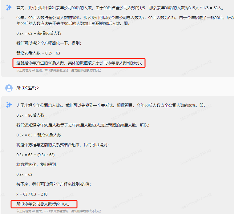 智譜AI首次回答中,直接告訴我們具體數值取決於公司今年總人數X的大小,這一回答相當於沒有回答。緊跟着我們又問X是多少?但智譜AI給出210人和正確答案45人相比,明顯錯誤。