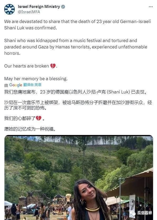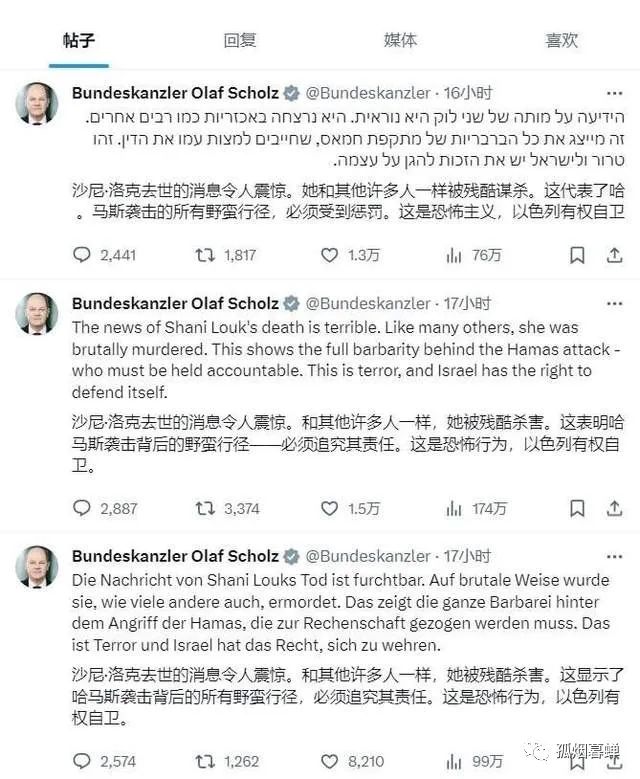 別的不説,我們就單説以色列外交部和朔爾茨就沙妮之死發的推特,表面上看,他們好像是在為這個姑娘的不幸離世表示哀悼,可實際上呢?他們的話題重心還是放在了以色列和力挺以色列的國家,過去這些天在各種公開場合都要反覆提及的那兩個主張上: