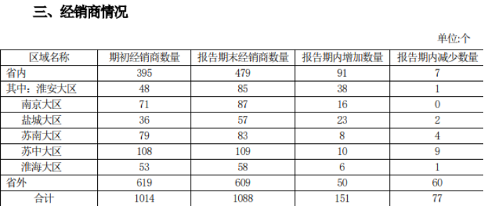 “省外策略目前聚焦3+4重點市場,確定10個重點板塊市場,以開系佈局省外。省外經銷商平均規模小於100萬元低於省內,按照新進+汰換的合計數量計算的經銷商變動率呈現下降趨勢、2022年顯著降低,穩定性增強。看好開系高勢能品牌打開環江蘇市場、省外策略調整後加速貢獻新增量。”申港證券表示。
