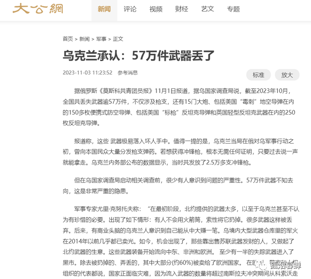 因為就在刷到那條短視頻的幾乎同一時間,我還在《參考消息》上看到了這樣一則新聞:據俄媒《莫斯科共青團員報》援引烏克蘭國家調查局的説法稱,截至今年10月,烏克蘭全國共丟失了各型武器裝備逾57萬件,其中包括各種槍支、大炮、包括美製“毒刺”和“標槍”在內的各型單兵導彈、其他配套彈藥,甚至可能還有火箭和導彈。