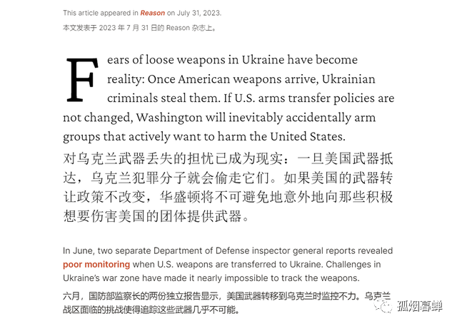 如果覺得俄媒報道的涉烏新聞不可信的話,那我們來看看美媒在相關話題上是怎麼説的。今年7月末,美國《理性》(Reason)雜誌曾經刊載過一篇文章,就北約援烏武器裝備不翼而飛的相關問題表示了擔憂。這篇文章指出,“西方在(北約)援烏武器一事上的擔憂已經成了現實:只要美國援助武器一運抵,烏克蘭的犯罪分子就會將它們偷走。要是美國還抱着如今這套軍援正常的觀念固守不改,那麼或早或晚,華盛頓一定會被自己扔出去的迴旋鏢打臉。