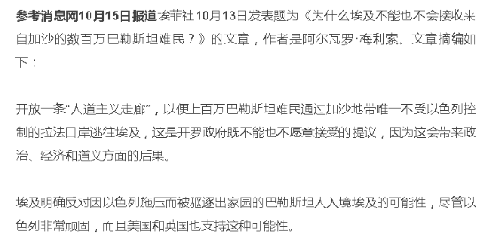為此埃及總統阿卜杜勒-法塔赫·塞西12日強調,巴勒斯坦人**“必須留在自己的土地上”**。埃菲社13日則發表了題為《為什麼埃及不能也不會接收來自加沙的數百萬巴勒斯坦難民?》的署名文章,為埃及的做法辯駁。