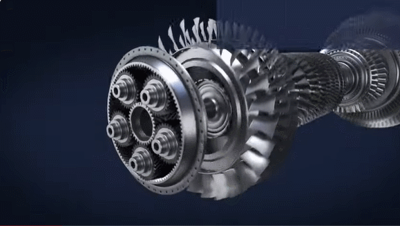在一般的雙轉子渦扇發動機中,風扇和低壓壓氣機(增壓級)連在同一根軸上,由低壓渦輪直接驅動。由於風扇直徑很大,無法達到太高的轉速,渦輪和壓氣機的轉速也就只能低於其最佳轉速,造成氣流效率損失,只能增加級數,因而增加了發動機的重量;另一方面,風扇的轉速要高於其最佳轉速,風扇葉尖的線速度超過音速,帶來阻力和噪音的問題。PW1000G發動機在低壓壓氣機和風扇之間設置了一套減速比約為3:1的行星齒輪減速器,低壓渦輪帶動低壓壓氣機以9160rpm的轉速旋轉(遠高於常規渦扇發動機的約4000~5000rpm),再通過減速齒輪驅動風扇以3250rpm的轉速旋轉,使兩部分都能工作在最佳轉速,從而實現降低油耗和噪音的效果。