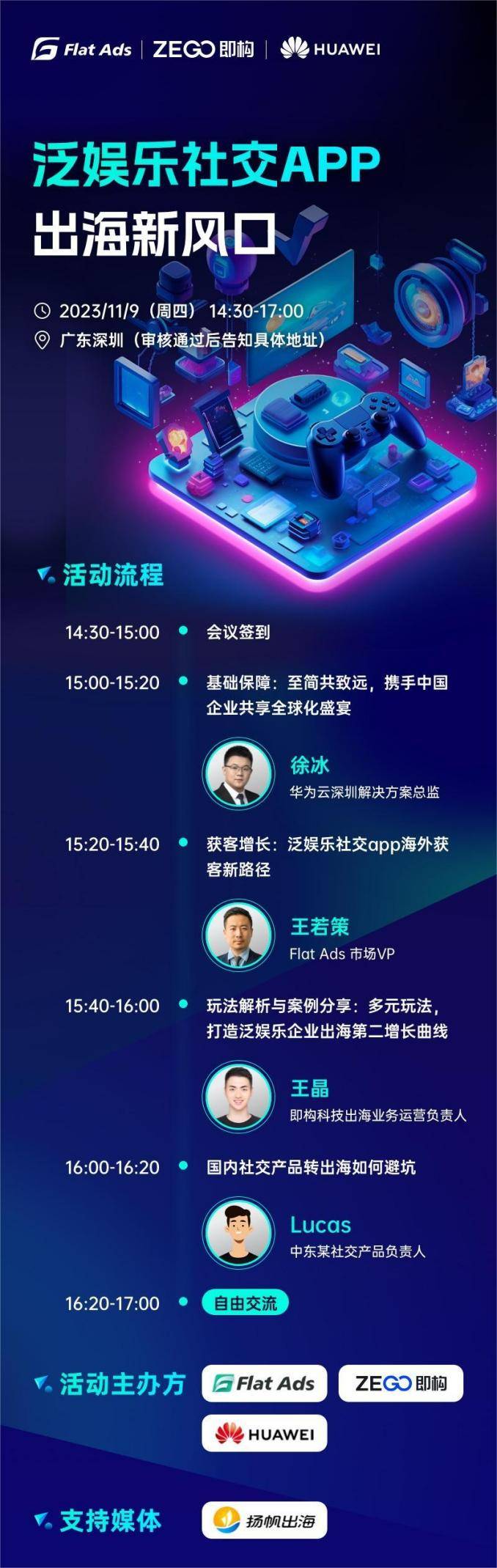 在本次沙龍活動中,Flat Ads市場VP王若策、華為雲深圳解決方案總監徐冰、即構科技出海業務運營負責人王晶將從出海獲客增長、基礎保障、玩法解析多方面分享行業見解,幫助中國企業更好地理解泛娛樂社交產品出海的新風口,實現廣告變現、收益最大化。