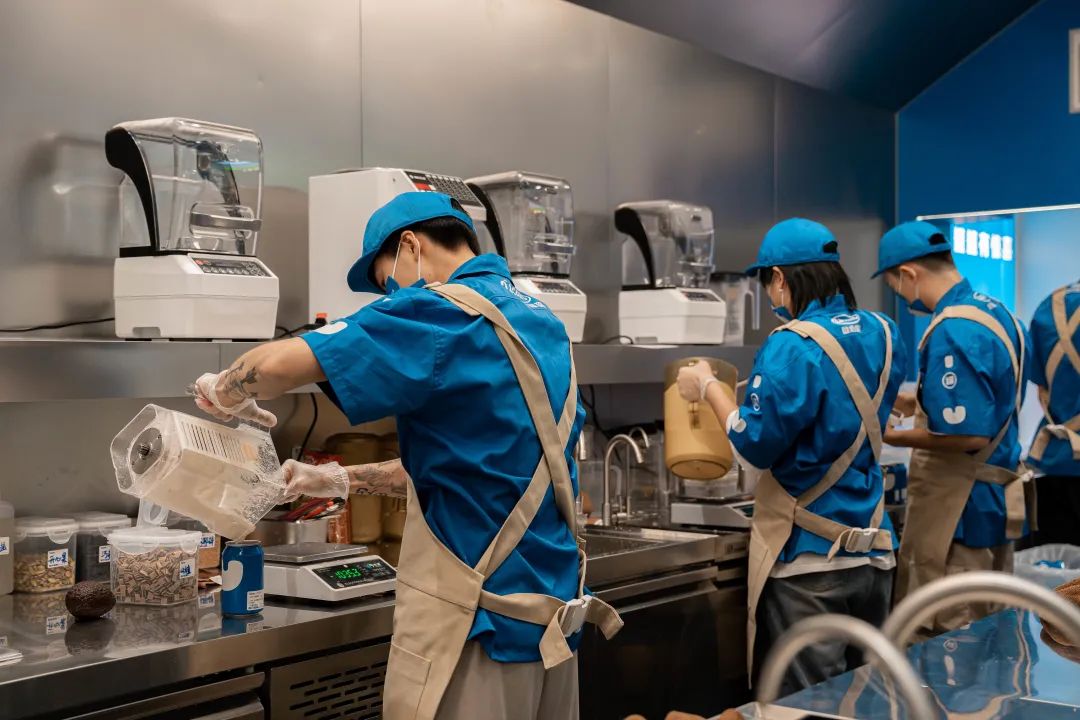 店員操作時,僅需將原料混合放入料理機中攪打,再倒入罐罐封裝,保證出品的高效與標準化。