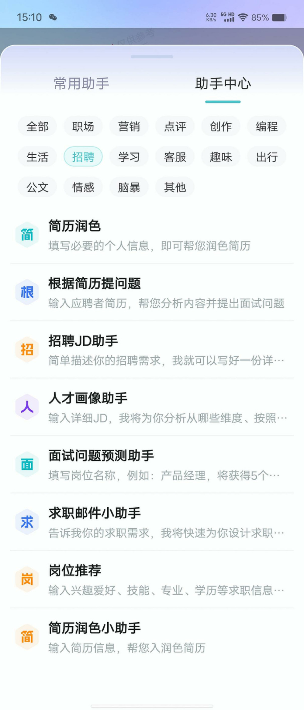 操作流程就是上拉出選擇助手頁面,選擇要調用的助手,選擇完成後發送出去,進入對應的助手模式,然後可以通過新建對話框,退出該助手模式,例如選擇招聘這個分類然後提問:幫我出一個招聘會計師崗位的內容。
