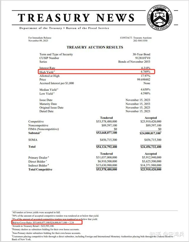 11月9日,美國財政部拍賣30年期國債的預期收益率為4.716%,中標利率是4.769%!