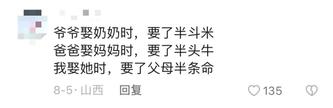 “爺爺娶奶奶時,要了半鬥米;爸爸娶媽媽時,要了半頭牛;我娶她時,要了父母半條命。”