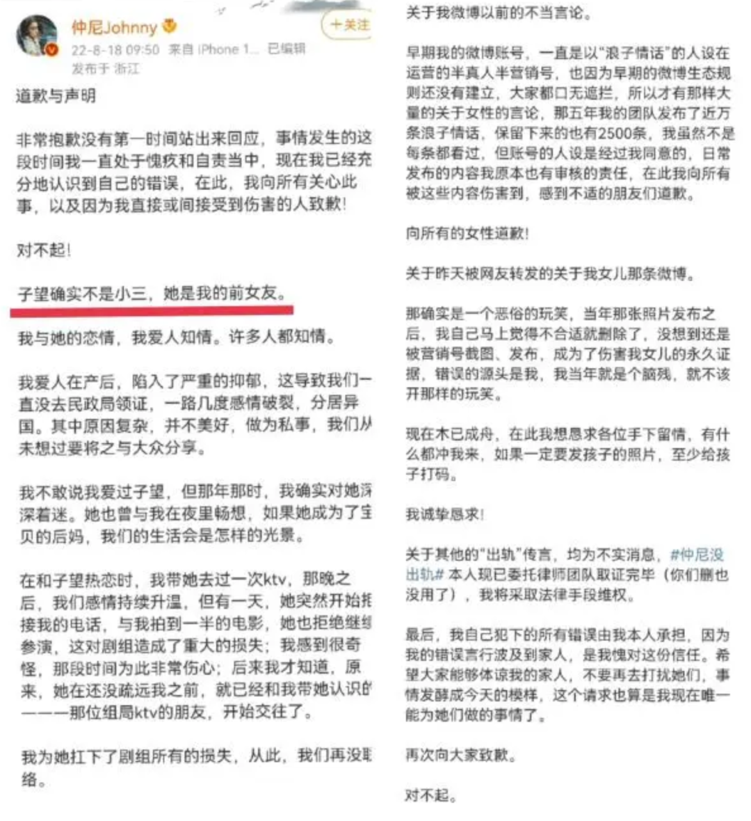 在網友的聲討和輿論壓力之下,他本人也只能發道歉聲明,實錘出軌,認錯。