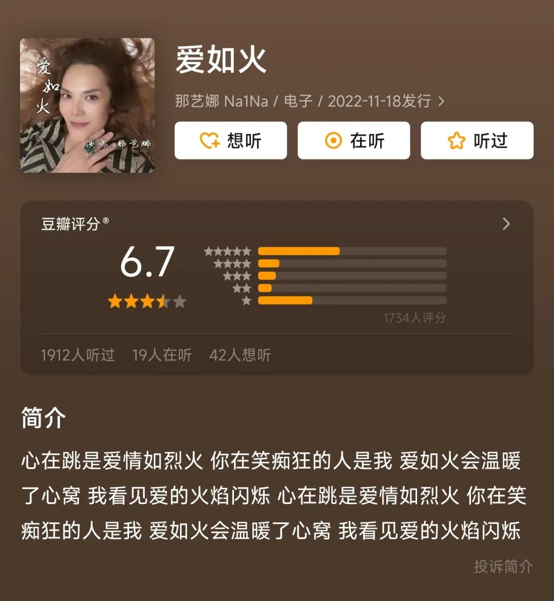她的一首《愛如火》,直接紅成KTV金曲,甚至在豆瓣都擁有正式詞條。