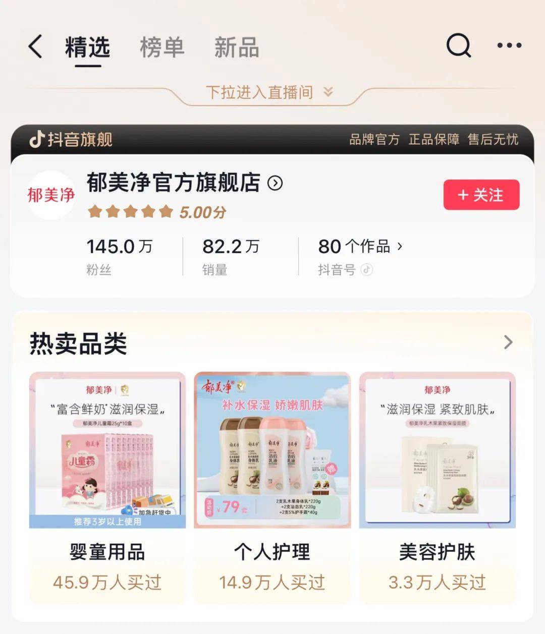在創造了抖音三天內漲粉超百萬的成績後,鬱美淨正在往長紅方向發展,“抖音商城雙11好物節”期間,大促第一波,鬱美淨品牌經典袋裝兒童面霜爆賣18.7萬件,乳木果身體乳熱賣3.1萬件。