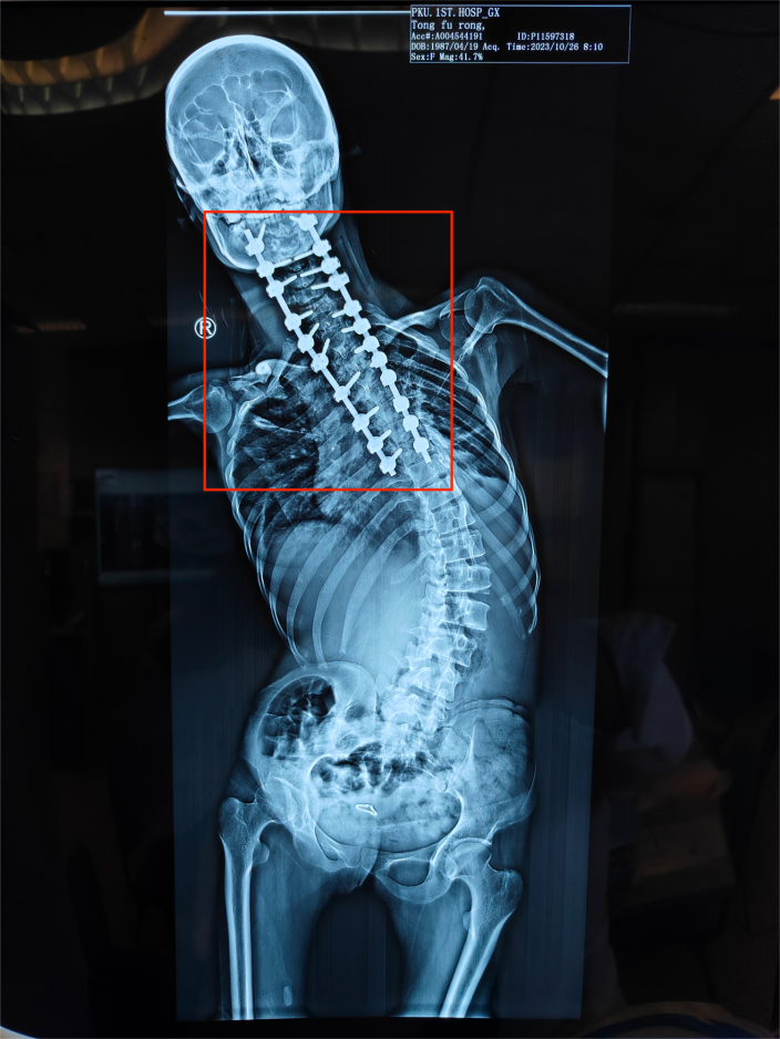 進一步評估後,王宇團隊給出的手術方案是,從其第二節頸椎到骨盆處開一條一米多長的刀口,分兩次手術將40多顆螺釘和4根鈦棒置於脊柱處固定,藉助整幅支架將脊柱支撐起來。