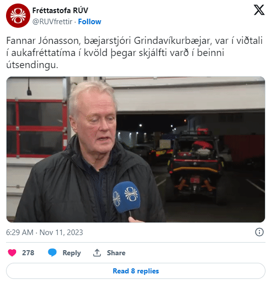 就連格林達維克的鎮長Fannar Jónasson接受電視採訪時,都遭遇了地震襲擊……