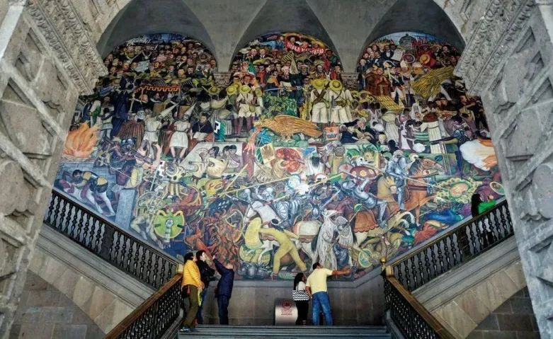 里維拉代表作之一、繪於墨西哥國家宮二樓樓梯的巨型壁畫《墨西哥民族史詩》。