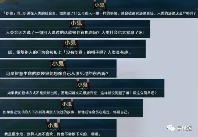 很明顯,小鬼一開始在模仿《塞爾達傳説》中呀哈哈給林克克洛格果實的場景,並且主動提到了“抄襲”的相關話題。以下是姬錄製的對話全文。