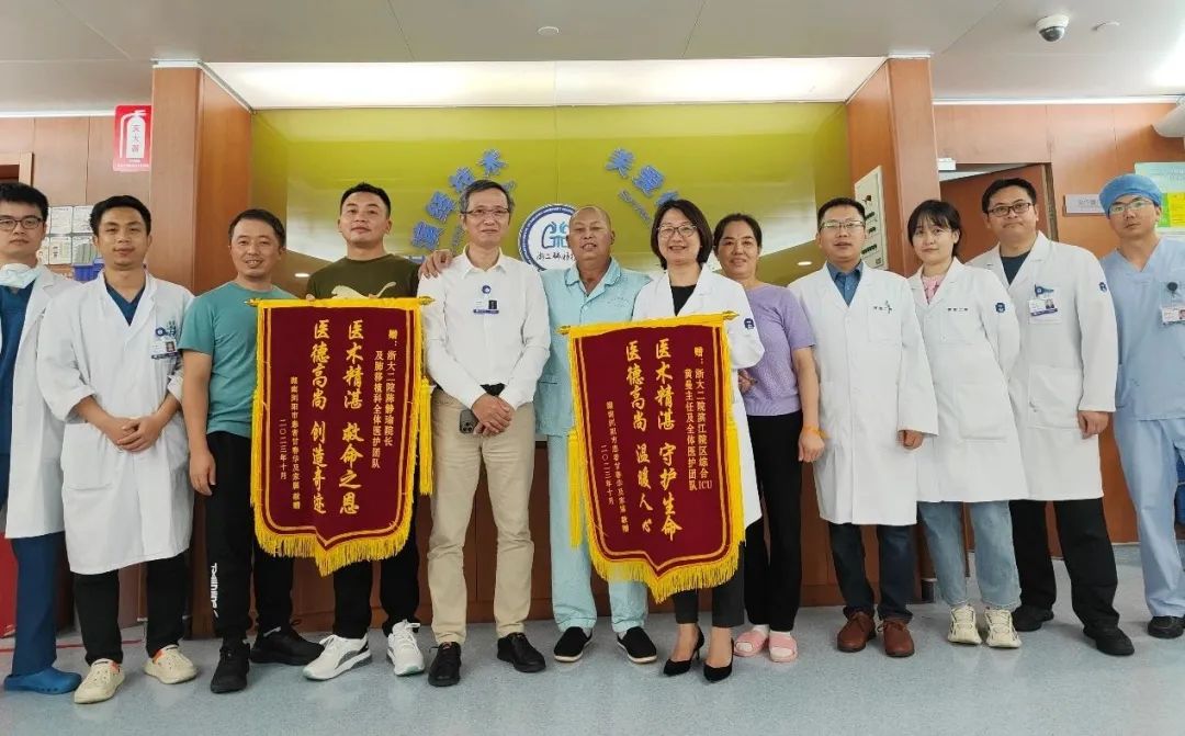 患者雙肺移植成功後,為陳靜瑜(左五)及其團隊送上錦旗。/受訪者提供