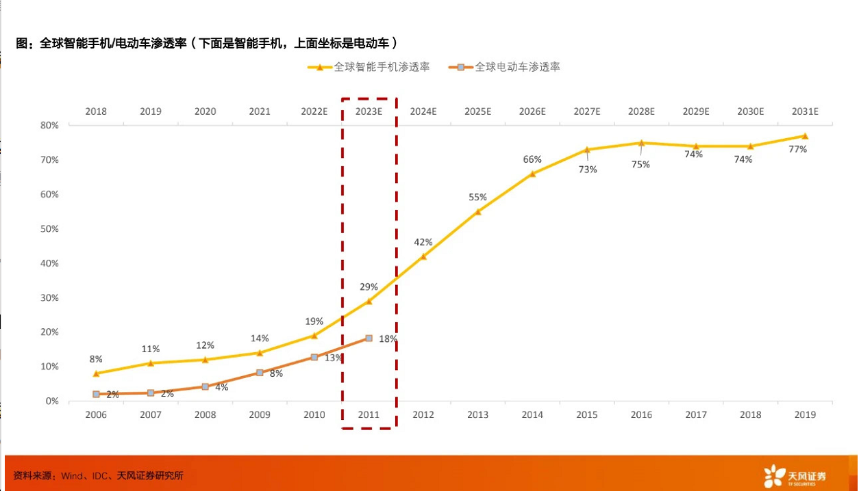 當年風靡一時的諾基亞、HTC、摩托羅拉、黑莓等品牌,如今也都在歷史的齒輪下銷聲匿跡了,從產業趨勢來説,當基本的需求得到滿足後,智能化便會成為體驗升級的核心,汽車智能化帶來的語音交互、自動駕駛等功能,的確可以有效解決用户的痛點,也因此成為各大汽車廠商發力的重心。如同上一輪智能手機的普及,一塊可觸摸的屏改變了整個市場,誕生出了大批十倍、數十倍的個股;而這一輪智能汽車的產業趨勢,剛剛嶄露頭角,滲透率有望擬合智能手機的滲透曲線,可比擬甚至級別更高的投資機會正在醖釀。