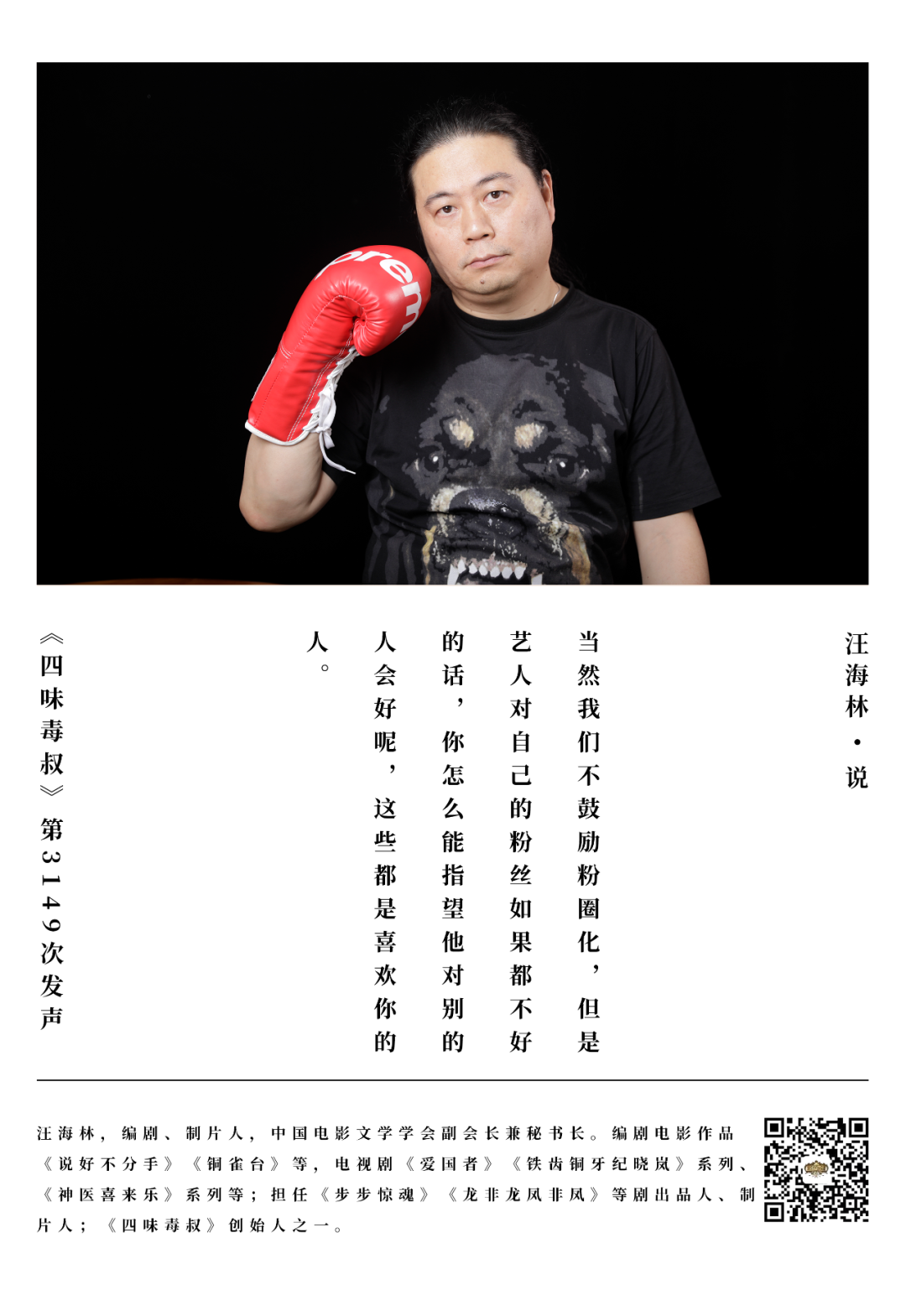 **汪海林:**拒絕粉圈這個東西,本身我覺得一個是我們的提倡,文藝界提倡不要粉圈化。演員還是去往藝術家的方向發展,鼓勵往這個方向發展,這是提倡,我認為這些藝人本身是有追求的,而且也是適應大的時代的要求,我覺得是主動去做的。這個特別好,而且我也覺得是一個明智的選擇,有些明星可能沒那麼明智,可能被經紀公司或者被什麼利益綁架了,那麼這種情況下,對於粉絲這塊特別看重,或者説他只能靠粉絲掙錢,沒法靠作品掙錢,這種情況下的藝人可能對粉絲的看重就超過其他藝人。