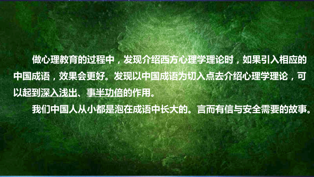 我們中國文化中也包括非常多的樸素心理學思想,比如我們中國的成語,所以如果從成語角度去入手去介紹心理學理論,可以起到深入淺出事半功倍的作用。我們中國人從小都是泡在成語中長大的,以我自己為例,我小時候,我的外婆父母教育我時,經常會用各種成語。我印象最深的就是言而有信,大人説你答應了別人的事情你就得做,如果你做不到你就不能答應。