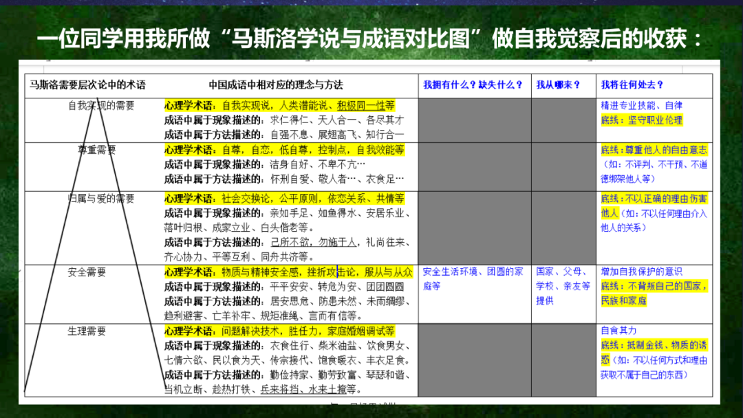 我現在給大家提供一個我的學生做的自我覺察圖。她看到我左邊這個馬斯洛需要層次論與中國成語中相似處的一覽表以後,做了相對應的一覽表。自我覺察是一個非常重要的心理學術語,是我們想要成長的人所必須具備的一種學習能力。這位同學是從三問框架入手做的這個自我覺察,我塗黑的地方關係到隱私。