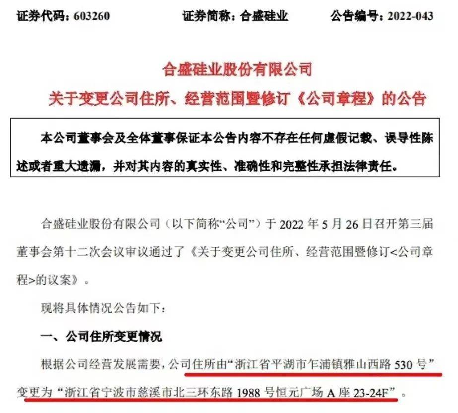2022年5月28日,合盛硅業公告稱公司向股東大會提交議案,公司住所將由浙江省平湖市搬遷至浙江省寧波市(編者按:平湖市隸屬於浙江省嘉興市)。