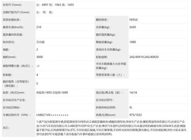 信息顯示,兩款純電動轎車產品商標為小米牌,企業名稱為北京汽車集團越野車有限公司,註冊地址為北京市順義區趙全營鎮兆豐產業基地同心路1號,生產地址為北京經濟技術開發區環景路21號院。