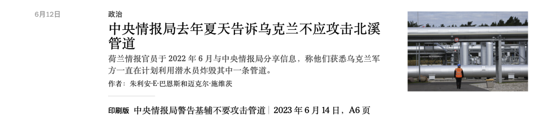 郵報的報道並不是獨家新聞,早在今年3月份,紐約時報就發表過指認親烏克蘭一方的情報組織是炸燬北溪管道的真兇。6月份,也發表了文章,説中央情報局早就得知烏克蘭的計劃,並且警告過烏克蘭一方。