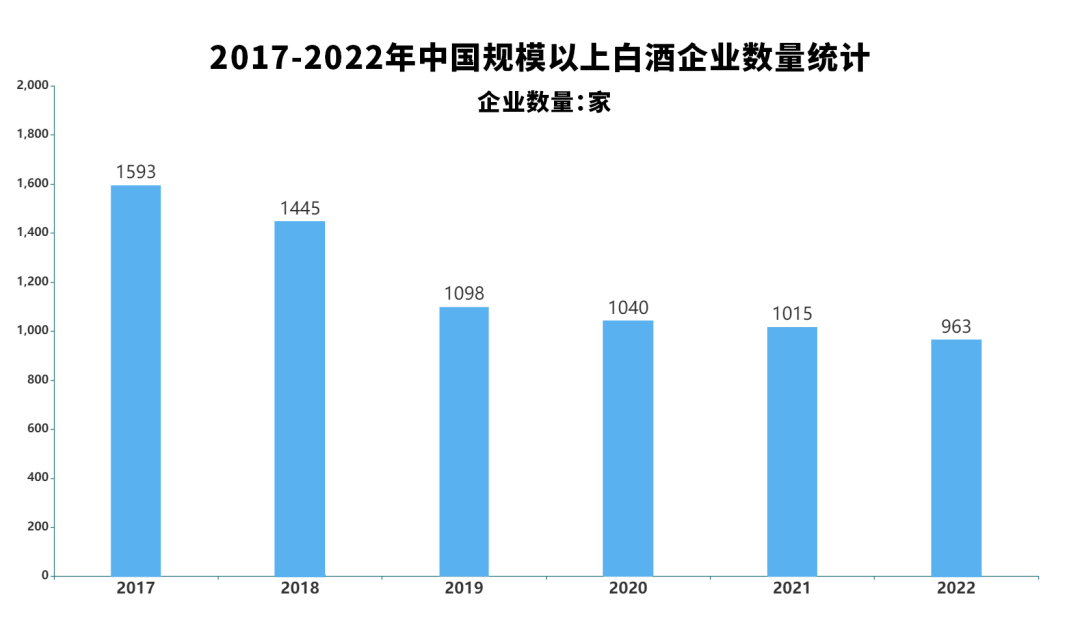 根據相關數據統計,我國規上白酒企業已從2017年的1593家降至2022年的963家。
