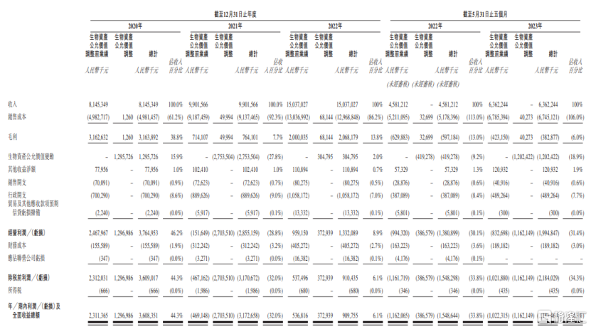 招股書顯示,2020年、2021年、2022年及2023年1-5月,德康農牧的營業收入分別為81.45億元、99.02億元、150.37億元和63.62億元,淨利潤分別為36.08億元、-31.73億元、9.1億元和-21.84億元。