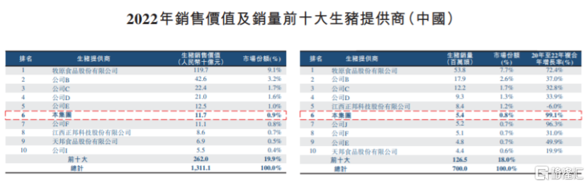 從養殖規模來看,德康農牧算是國內的豬禽養殖大户了。據弗若斯特沙利文報告,中國生豬市場高度分散,按2022年生豬的銷售價值及銷量來算,前十大參與者分別佔總市場份額的19.9%及18%,其中,德康農牧以0.9%、0.8%的市場份額排在第六。