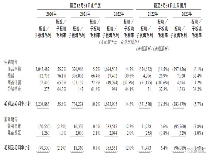 具體來看,生豬銷售是德康農牧的重要收入來源。招股書顯示,2020年至2023年1-5月,公司的生豬銷售貢獻了70%以上的收入,家禽銷售貢獻的收入在20%左右。