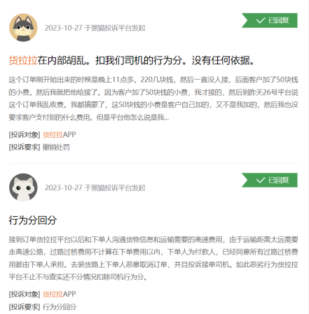 在黑貓投訴中的確存在大量司機對貨拉拉的投訴,主要集中在扣司機行為分,不退還保證金等情況。